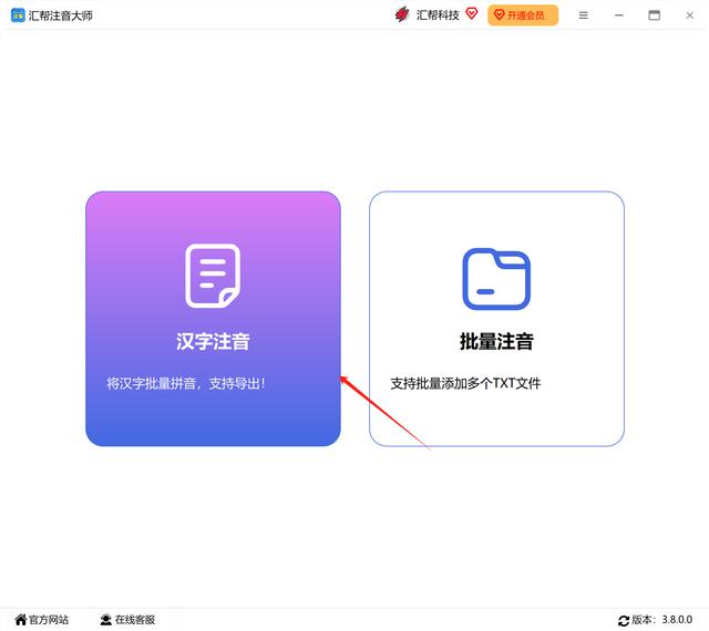 第一步:把“汇帮注音大师”软件下载安装到自己电脑中,打开软件,我们可以看到“汉字注音”和“批量注音”两个功能。这里我们选择左侧的“汉字注音”点击进入