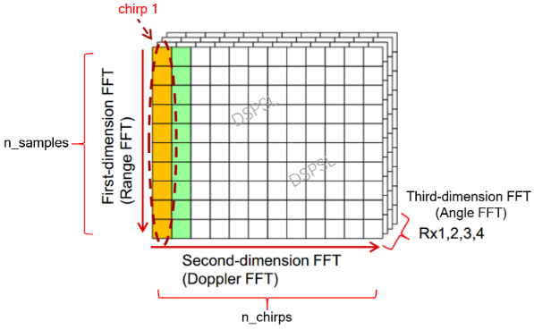 3DFFT 分别在距离维,速度维,天线维FFT; 距离维有256个sample, 速度维有128个chirps,天线维角度维有4个通道;每个chirp采样256个点,涉及到采样定理,最终形成256x128x4cell