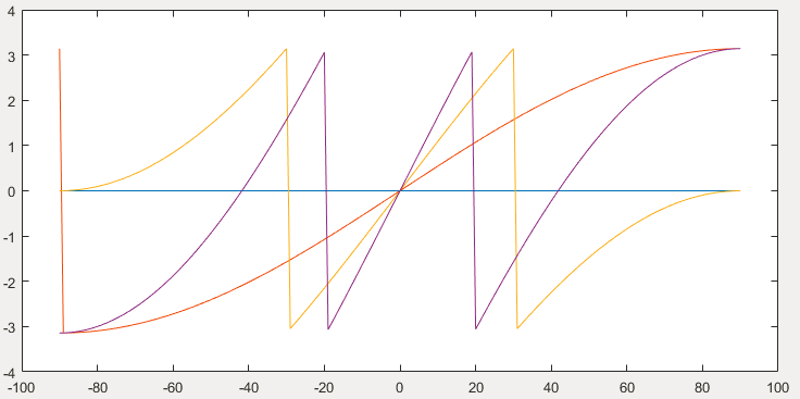 c=3.0e8; f0=77.0e6; lambd=c/f0; d=[0,1,2,3]*lambd/2; real_angle= (0:180)*pi/180 - pi/2; fai = 2*pi*sin(real_angle')* d/lambd; for i=2:length(d) if ~isempty(find(fai(:,i) >=pi)) fai(find(fai(:,i) >=pi),i) = fai(find(fai(:,i) >=pi),i)-2*pi; end if ~isempty(find(fai(:,i) <=-pi)) fai(find(fai(:,i) <=-pi),i) = fai(find(fai(:,i) <=-pi),i)+2*pi; end end lut = exp(1*1i*fai); lut_deg =angle(lut); plot(real_angle*180/pi,lut_deg);