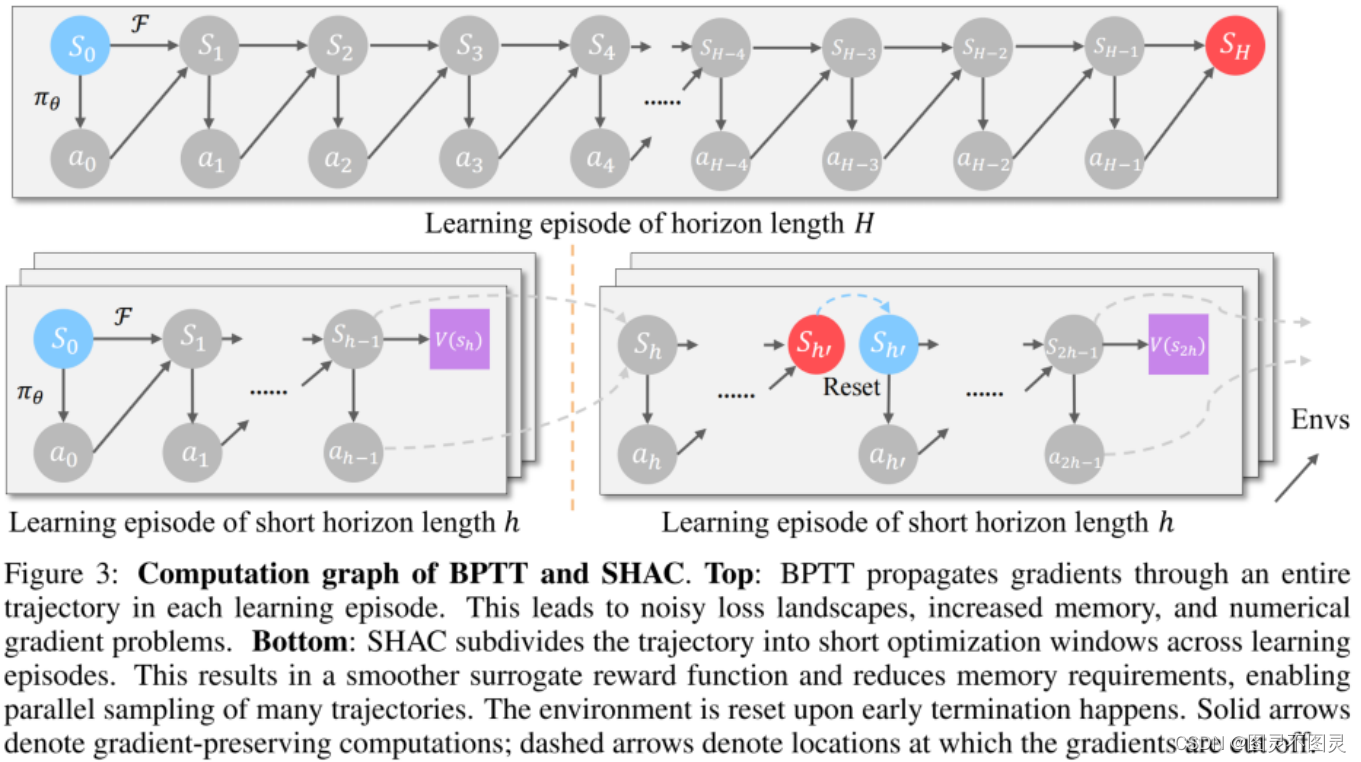 图3: BPTT和SHAC的计算图。顶部:BPTT在每个学习过程中通过整个轨迹传播梯度。这导致了嘈杂的损失现象、增加的记忆和数值梯度问题。底部:SHAC将学习期间的轨迹细分为较短的优化窗口。这导致了一个更平滑的替代反馈功能,并减少了记忆需求,使许多轨迹的并行采样。在提前终止时重置环境。实心箭头表示保持梯度的计算;虚线箭头表示梯度被切断的位置。