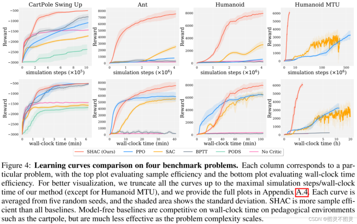 图4: 四个基准问题的学习曲线比较。每一列对应一个特定的问题,顶部图评估采样效率,底部图评估计算时间效率。为了更好地可视化,我们将所有曲线截断到我们的方法的最大模拟步长/计算时间(类人猿MTU除外),并在附录A.4中提供了完整的图。每条曲线都从5个随机的种子中取平均值,阴影区域表示标准偏差。SHAC比所有基线都更具有采样效率。在诸如碳基极等教学环境中,无模型基线在计算时间上具有竞争力,但随着问题复杂性的增加,其效率要低得多。