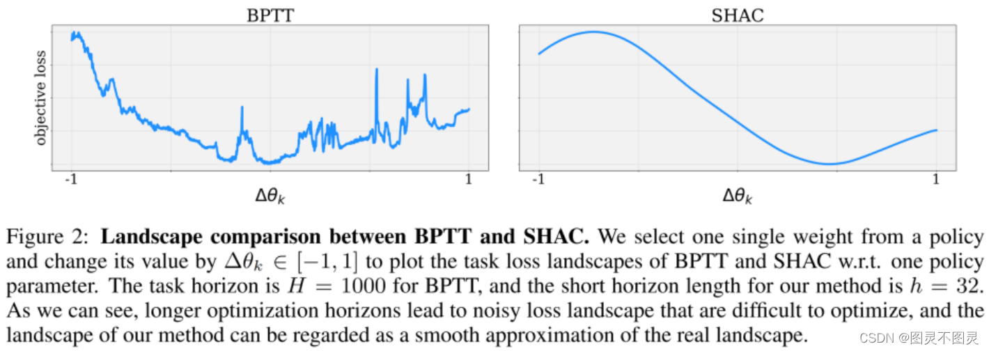 图2: BPTT和SHAC之间的现象比较。我们从一个策略中选择一个单一的权重,并通过∆θk∈[−1,1]改变其值,以绘制BPTT和SHAC w.r.t.的任务损失情况一个策略参数。BPTT的任务视界为H=1000,我们的方法的短视界长度为H=32。正如我们所看到的,更长的优化范围会导致难以优化的噪声损失,而我们的方法可以看作是真实情况的平滑近似。