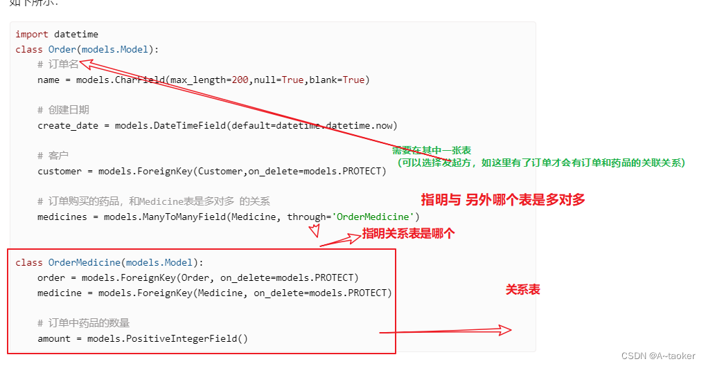 1.需要在 一个表如上 订单表中 指明 和 药品表 是多对对关系,并指明了哪个是关联表