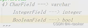 - default 指定默认值,”“ 或者 123 或者 True(BooleanField 等,其他也有这个)
