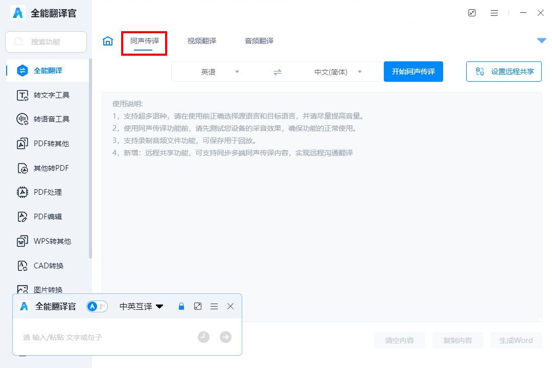全能翻译官是一款功能强大的同声传译工具,支持多种语言的实时翻译。