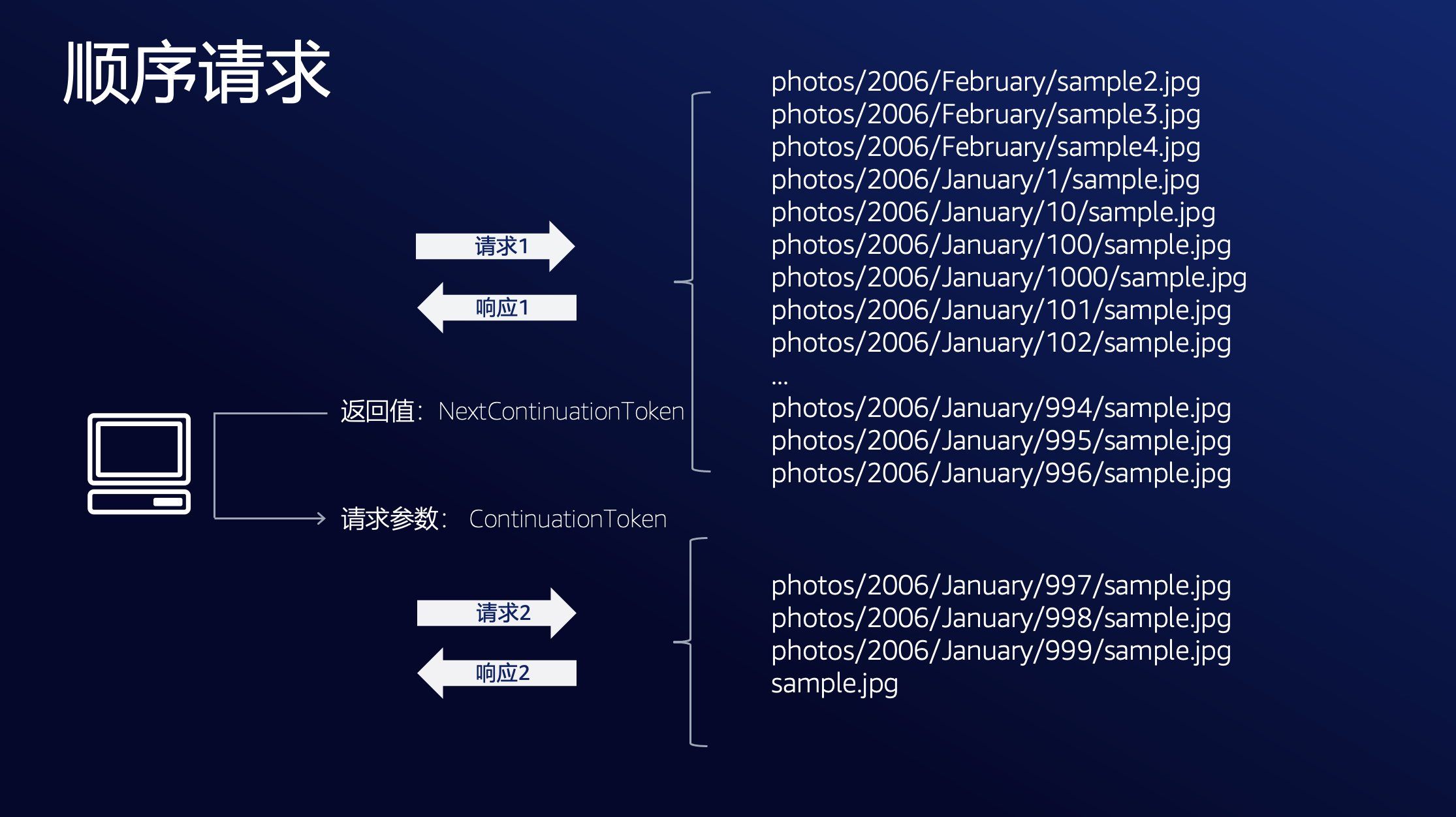 返回符合预期,使用 start-after 参数,我们把两个顺序执行的 API 变成了无相互依赖,可并执行的版本,但你可能会问,我怎么能正好知道请求 2 的起始 Object Key 应该是"photos/2006/January/996/sample.jpg"呢?
