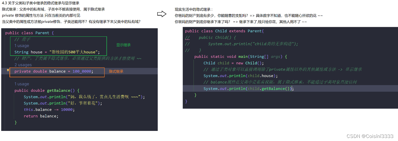 隐式继承:父类中的私有域,子类中不能直接使用,属于隐式继承