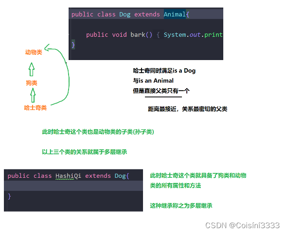 // Animal.java public class Animal{ String name; int age; public void eat(){ System.out.println(name + "正在吃饭"); } public void sleep(){ System.out.println(name + "正在睡觉"); } } // Dog.java public class Dog extends Animal{ void bark(){ System.out.println(name + "汪汪汪~~~"); } } // Cat.Java public class Cat extends Animal{ void mew(){ System.out.println(name + "喵喵喵~~~"); } } // TestExtend.java public class TestExtend { public static void main(String[] args) { Dog dog = new Dog(); // dog类中并没有定义任何成员变量,name和age属性肯定是从父类Animal中继承下来的 System.out.println(dog.name); System.out.println(dog.age); // dog访问的eat()和sleep()方法也是从Animal中继承下来的 dog.eat(); dog.sleep(); dog.bark(); } }