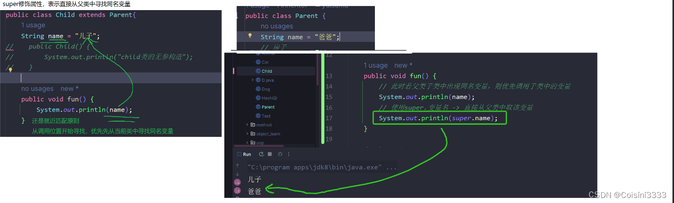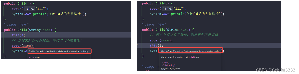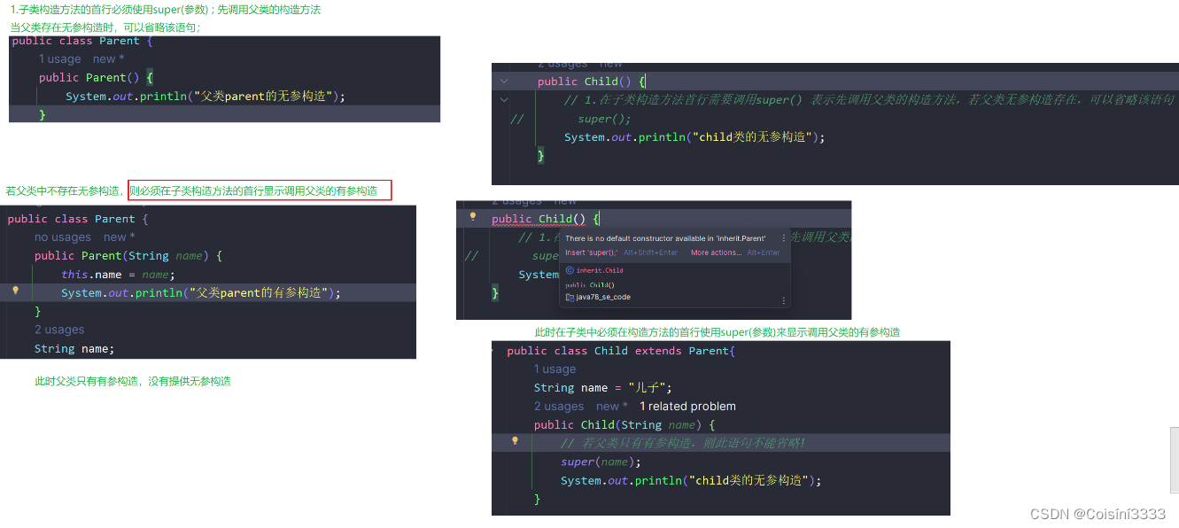 3、若父类中不存在无参构造,则super关键字必须写在子类构造方法首航,因此此时在子类中不存在子类构造方法之间的相互调用!!!(this(参数)也得写在构造方法首行)=》矛盾。
