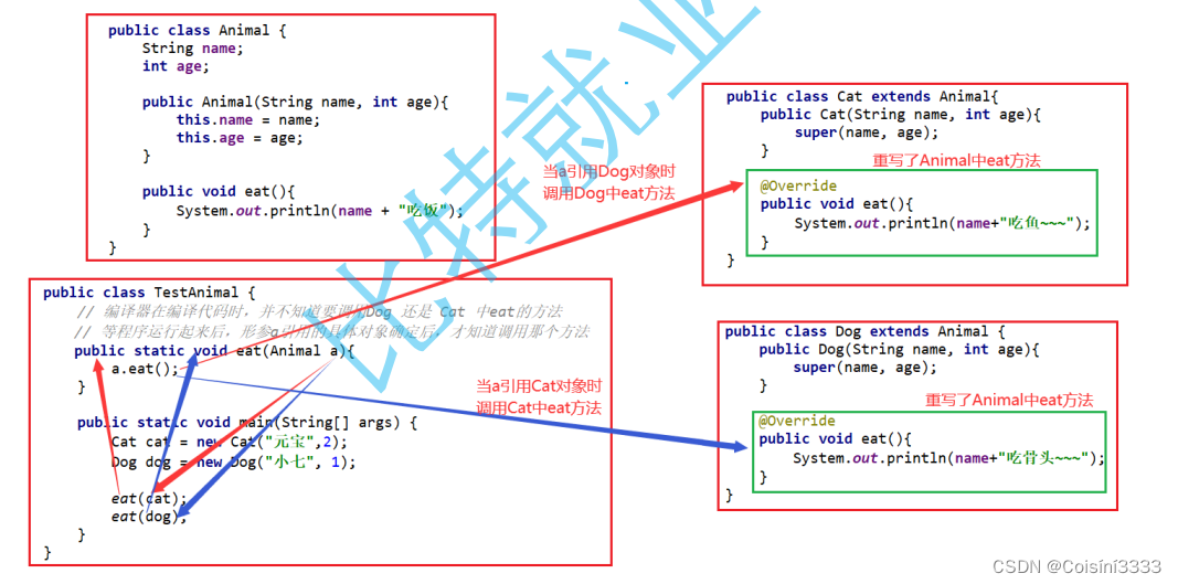 public class Animal { String name; int age; public Animal(String name, int age){ this.name = name; this.age = age; } public void eat(){ System.out.println(name + "吃饭"); } } public class Cat extends Animal{ public Cat(String name, int age){ super(name, age); } @Override public void eat(){ System.out.println(name+"吃鱼~~~"); } } public class Dog extends Animal { public Dog(String name, int age){ super(name, age); } @Override public void eat(){ System.out.println(name+"吃骨头~~~"); } } ///分割线// public class TestAnimal { // 编译器在编译代码时,并不知道要调用Dog 还是 Cat 中eat的方法 // 等程序运行起来后,形参a引用的具体对象确定后,才知道调用那个方法 // 注意:此处的形参类型必须是父类类型才可以 public static void eat(Animal a){ a.eat(); } public static void main(String[] args) { Cat cat = new Cat("元宝",2); Dog dog = new Dog("小七", 1); eat(cat); eat(dog); } } 运行结果: 元宝吃鱼~~~ 元宝正在睡觉 小七吃骨头~~~ 小七正在睡觉