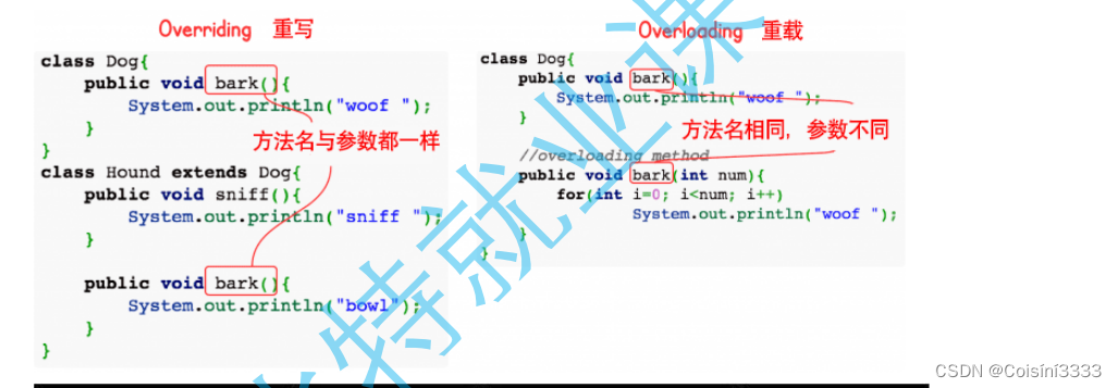 重写(override):也称为覆盖。重写是子类对父类非静态、非private修饰,非final修饰,非构造方法等的实现过程 进行重新编写, 返回值和形参都不能改变。即外壳不变,核心重写!重写的好处在于子类可以根据需要,定义特定 于自己的行为。 也就是说子类能够根据需要实现父类的方法。