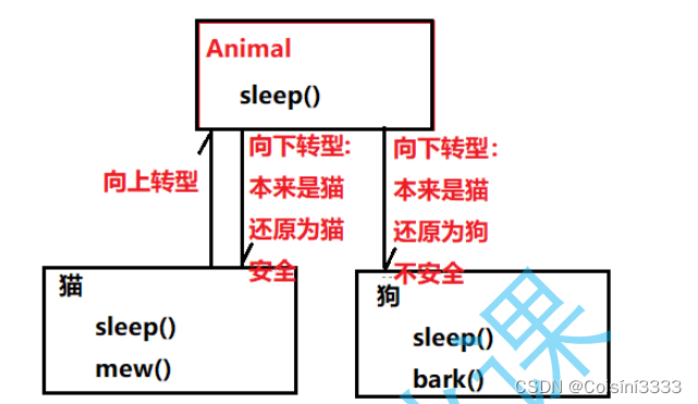 将一个子类对象经过向上转型之后当成父类方法使用,再无法调用子类的方法,但有时候可能需要调用子类特有的 方法,此时:将父类引用再还原为子类对象即可,即向下转换。