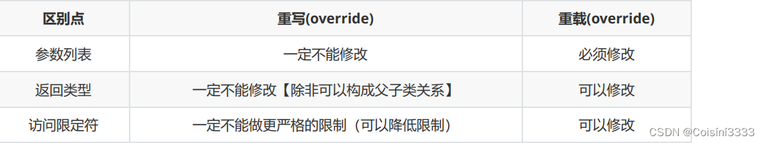 访问权限不能比父类中被重写的方法的访问权限更低。例如:如果父类方法被public修饰,则子类中重写该方 法就不能声明为 protected