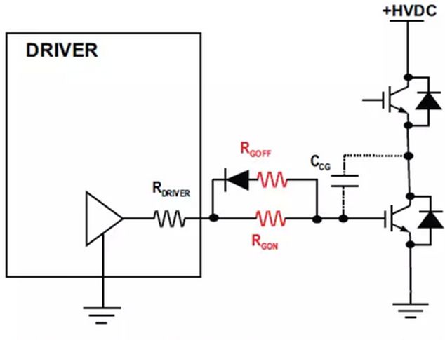 采用了独立的门极开通和关断电阻,门极导通电阻RGON影响IGBT导通期间的门极充电电压和电流;增大这个电阻将减小门极充电的电压和电流,但会增加开通损耗。