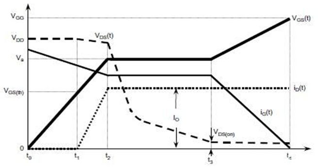 MOSFET的栅极驱动过程,可以简单的理解为驱动源对MOSFET的输入电容(主要是栅源极电容Cgs)的充放电过程;当Cgs达到门槛电压之后, MOSFET就会进入开通状态;当MOSFET开通后,Vds开始下降,Id开始上升,此时MOSFET进入饱和区;但由于米勒效应,Vgs会持续一段时间不再上升,此时Id已经达到最大,而Vds还在继续下降,直到米勒电容充满电,Vgs又上升到驱动电压的值,此时MOSFET进入电阻区,此时Vds彻底降下来,开通结束。(由于米勒电容阻止了Vgs的上升,从而也就阻止了Vds的下降,这样就会使损耗的时间加长,从而增加了损耗。)