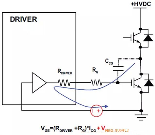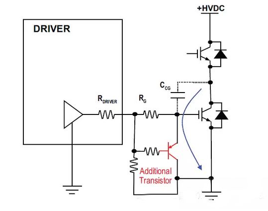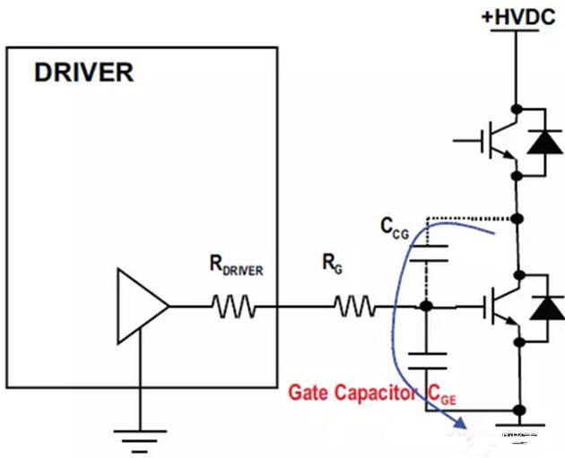 米勒效应在单电源门极驱动过程中非常显著。基于门极G与集电极C之间的耦合,在IGBT关断期间会产生一个很高的瞬态dv/dt,这样会引发门极VGE间电压升高而导通,这里存在着潜在的风险。