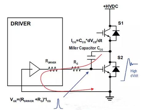 如上图所示,上管IGBT(S1)在导通时,S1处于半桥拓扑,此时S1会产生一个变化的电压dV/dt,这个电压通过下管IGBT(S2)。电流流经S2的寄生米勒电容CCG、栅极电阻RG和内部驱动栅极电阻RDRIVER。这个产生的电流使门极电阻两端产生电压差,这个电压如果超过IGBT的门极驱动门限阈值,将导致寄生导通。