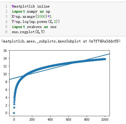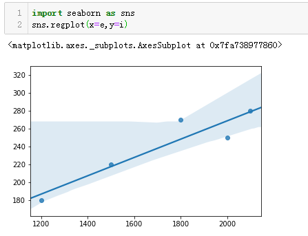 主对角线的值是两个变量的自相关系数,自然都是1,次对角线的值就是两组数据的Pearson相关系数值。我们可以看出耗电量和销售收入正相关性还是很高的,用Seaborn的回归图也能比较直观的看出两组数据的相关水平。如下图: