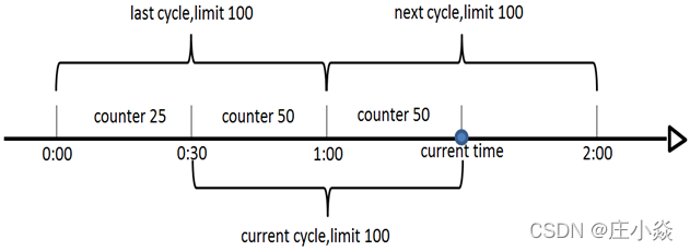 滑动窗口算法是将时间周期分为N个小周期,分别记录每个小周期内访问次数,并且根据时间滑动删除过期的小周期。如下图,假设时间周期为1min,将1min再分为2个小周期,统计每个小周期的访问数量,则可以看到,第一个时间周期内,访问数量为75,第二个时间周期内,访问数量为100,超过100的访问则被限流掉了