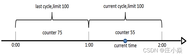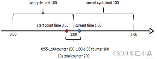 这个算法通常用于QPS限流和统计总访问量,对于秒级以上的时间周期来说,会存在一个非常严重的问题,那就是临界问题,如下图:
