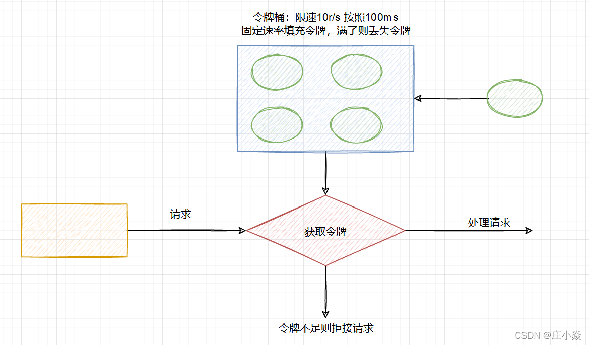令牌桶算法是程序以r(r=时间周期/限流值)的速度向令牌桶中增加令牌,直到令牌桶满,请求到达时向令牌桶请求令牌,如获取到令牌则通过请求,否则触发限流策略