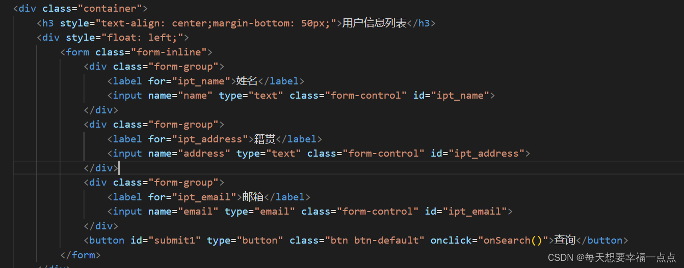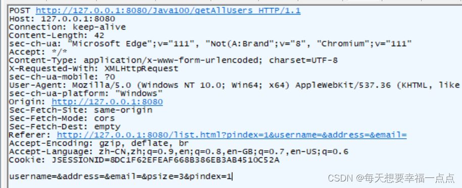 前端: POST /GetAllUsers Http/1.1 Content-Type: application/x-www-form-urlencoded; charset=UTF-8 username=&address=&email=&psize=3&pindex=1 后端: { "data": { "count":1,//代表根据条件查询的总条数 "resultlist"://代表着当前页面所展示的用户信息 [{ "userID":1,"username":"小淘气","loginname":"zhangsan","password":"","sex":"男","age":25,"address":"中国","":"25","email":"139.com","isadmin":1,"createtime":"2023-04-03T11:37:03.000+00:00","updatetime":"2023-04-03T11:37:03.000+00:00"}]}, "state":1, "status":200 }1)前端传递参数分析:页码 页数 姓名 籍贯 邮箱,其中姓名支持模糊查询