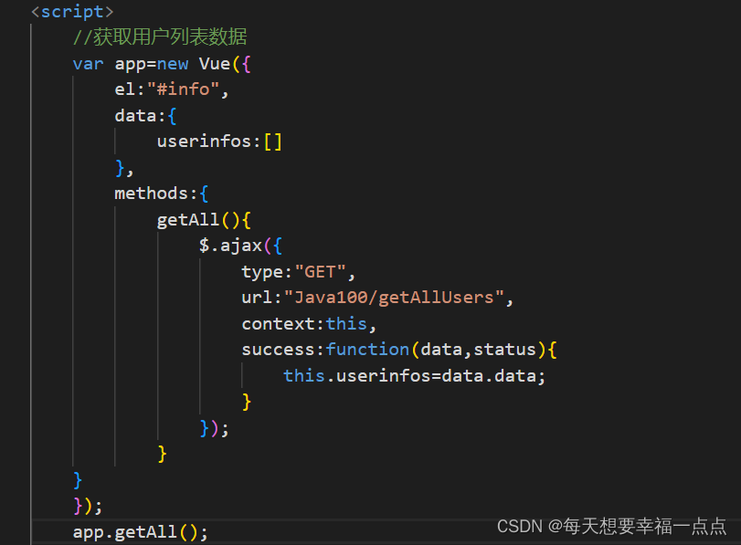 讯享网<script> var app=new Vue({ el:"#info", data(){ return{ userInfos:[{ "userID":2,"userName":"李佳伟","loginName":null, "passWord":"admin","sex":"男","address":"内蒙古赤峰市敖汉旗", "":"","email":"139.com","isAdmin":"0","createTime":"2022-11-16T04:30:38.000+00:00", "updateTime":"2022-11-16T04:30:38.000+00:00"}] } }, methods:{ GetAll(){ $.ajax({ type:"GET", url:"Java100/GetAll", context:this, success:function(data,status){ console.log(typeof data.data); console.log(data,status); app.userInfos= data.data; console.log(app.userInfos); } }); } } }); // app.GetAll();后端代码: