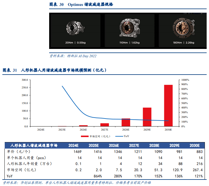 人形机器人的量产将为减速器开辟百亿级新市场。特斯拉 Optimus 躯干共有 28 个关 节执行器,其中旋转关节 14 个,包括肩部 6 个、肘部 2 个、腰部 2 个、髋部 4 个。 旋转关节由无框力矩电机+谐波减速器+力矩传感器+双编码器构成,其中谐波减速 器规格为 3 种,分别为 20Nm/110Nm/180Nm。参考该方案,假设 2024 年起人形机器人将实现从 0 到 1 的跨越,且谐波减速器价格随着产量的提升呈逐步下降趋势,预 计 2024-2030 年人形机器人用谐波减速器市场将由 0.2 亿元增长至 267.4 亿元。