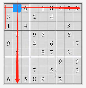 (2)任一格子(没有数字)所填数字必须需要符合的要求;所在9x9的大格子中的横,竖方向都没有该元素,并且所在的3x3的九宫格也没有该元素(如下图所示蓝色表示所填元素);箭头表示所在行列红色包围的9宫格;