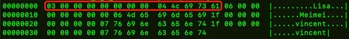这里只介绍第一个索引(3,'Lisa')的存储格式,剩下的可以自己去梳理。Id是UInt64类型的,所以使用8字节来存储。从上图可以看出前8个字节为0x03,以小端模式来存储,接下来可以看到其它文件都是以小端模式来存储。Name是String类型,属于变长字段,所以会先使用1个字节来描述String的长度,由于Lisa的长度是4,所以第9个字节为0x04,再接下来就是Lisa的ASCII码。