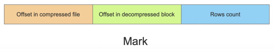mrk2文件格式比较固定,primary.idx文件中的每个索引在此文件中都有一个对应的Mark,Mark的格式如下图所示: