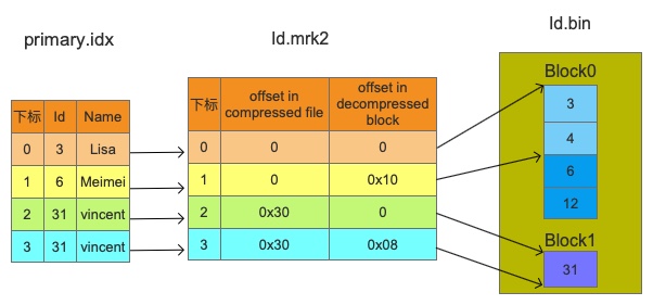 通过primary.idx中的索引寻找mrk2文件中对应的Mark非常简单,如果要寻找第n(从0开始)个index,则对应的Mark在mrk2文件中的偏移为n*24,从这个偏移处开始读取24 Bytes即可得到相应的Mark。
