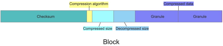 每个Block都会包含若干个Granule,具体有多少个Granule是由参数min_compress_block_size控制,每次Block中写完一个Granule的数据时,它会检查当前Block Size是否大于等于min_compress_block_size,如果满足则会把当前Block进行压缩然后写到磁盘中,不满足会继续等待下一个Granule。
