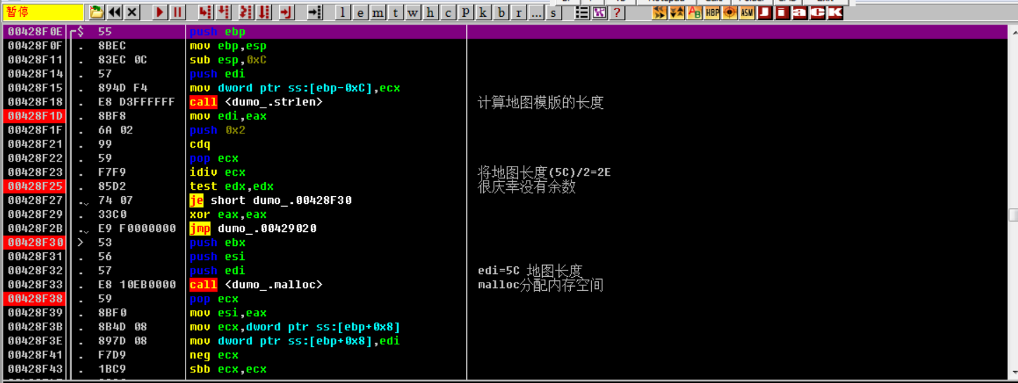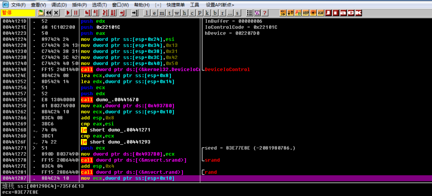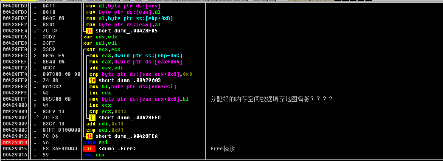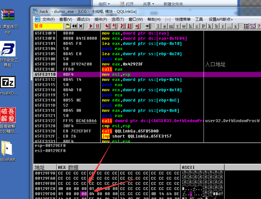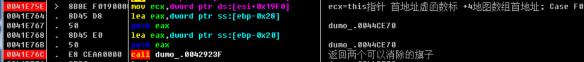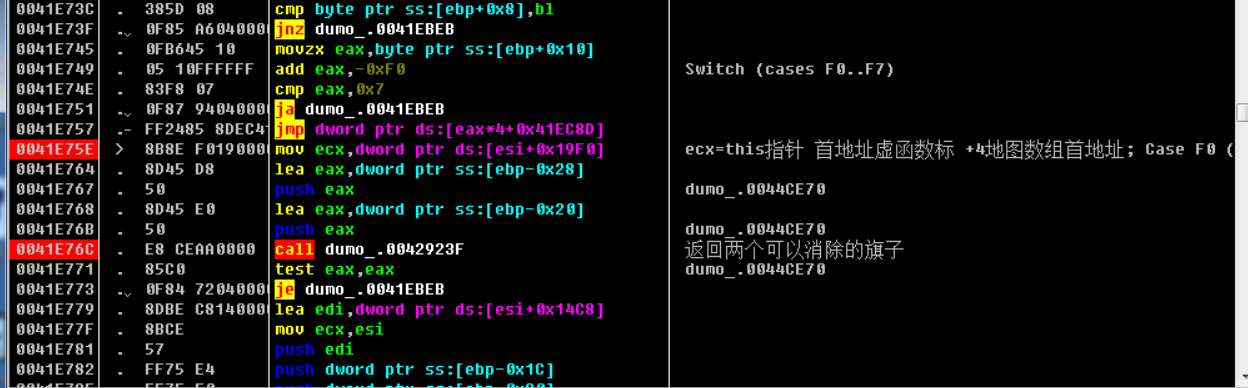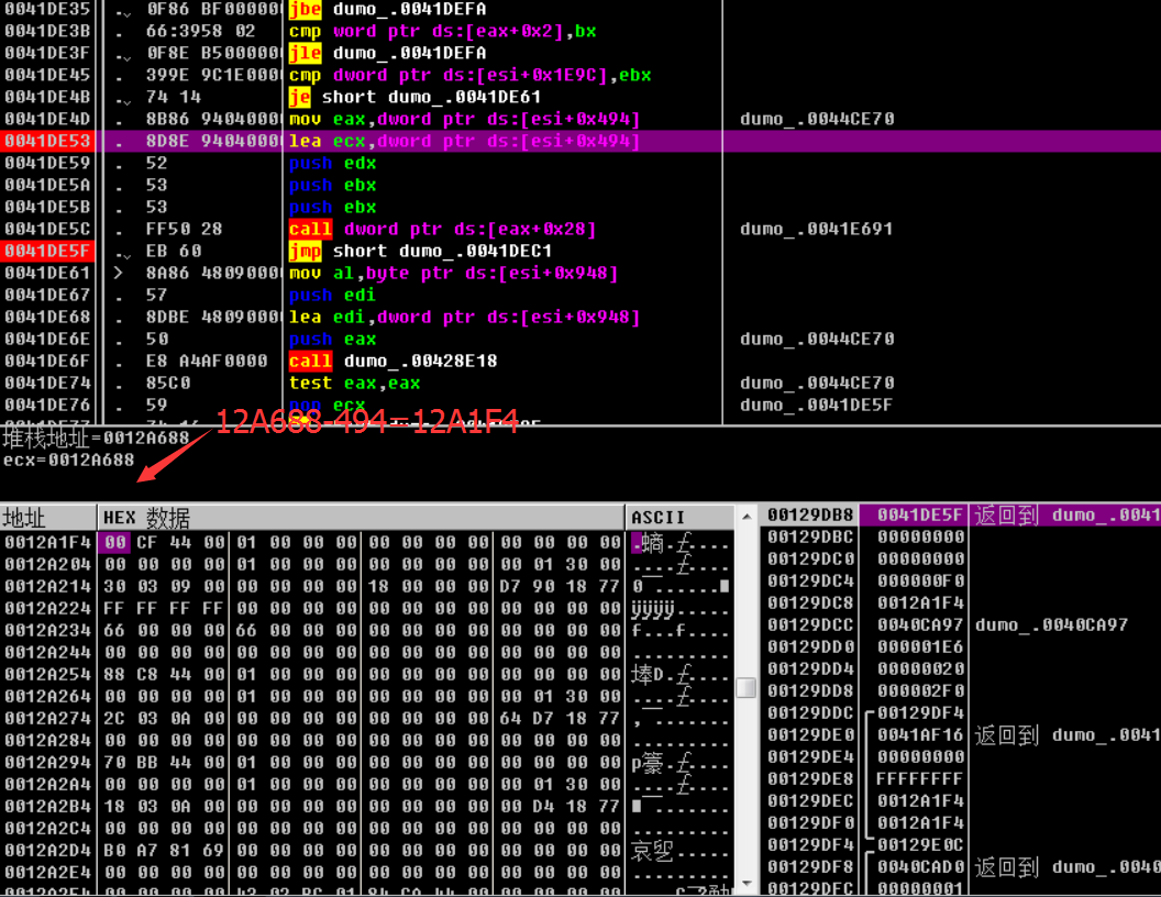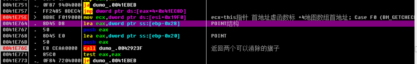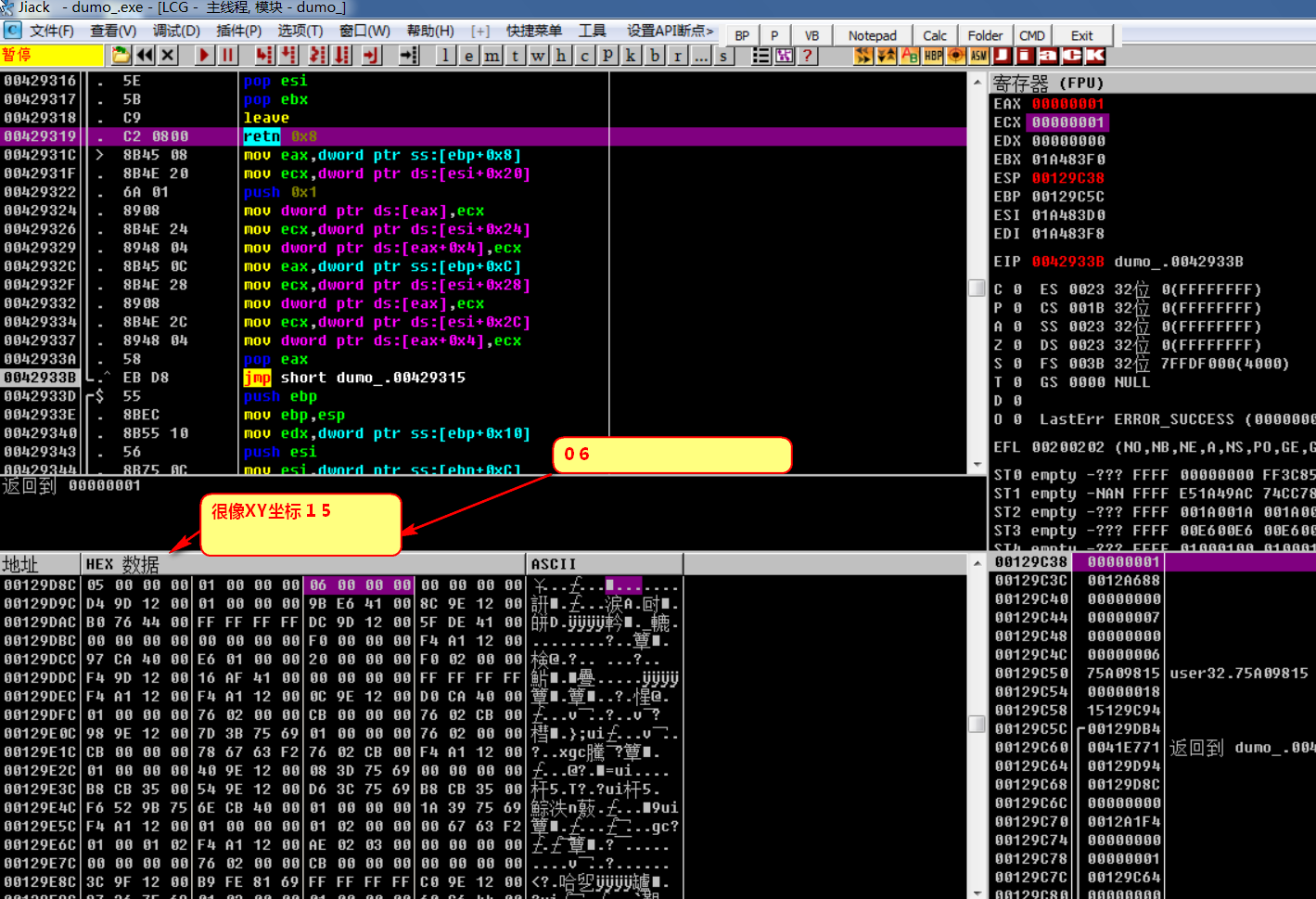 讯享网//模拟call代码 //我们发现esi+0x19F0的esi不存在基地址 //但是esi+0x19f0跟用[ESI+0X1E84],得到的结果都是一样的 //那么我们就用esi+0x1E84(esi有基地址)代替esi+0x19f0 /* 0041E75E > \8B8E F0 mov ecx, dword ptr ds : [esi + 0x19F0]; ecx = this指针 首地址虚函数标 + 4地图数组首地址; Case F0(BM_GETCHECK) of switch 0041E749 0041E764 . 8D45 D8 lea eax, dword ptr ss : [ebp - 0x28]; POINT结构 0041E767 . 50 push eax 0041E768 . 8D45 E0 lea eax, dword ptr ss : [ebp - 0x20]; POINT 0041E76B . 50 push eax 0041E76C.E8 CEAA0000 call dumo_.0042923F; 返回两个可以消除的旗子坐标 */ POINT FirstDot = { 0 }; //第一个消消乐的XY坐标点 POINT SecondDot = { 0 }; //第二个消消乐的XY坐标点 MessageBox(0, L"找到了注入点", 0, 0); _asm{ mov eax, 0x45DCF8 mov eax, dword ptr[eax] //取45DCF8里的值 12A1F4 mov ecx, dword ptr[eax + 0x1E84] //取12C078里的值 013A83D0 里面首4个字节是虚函数表 +4是地图首地址 //以上三句等价于mov ecx,[esi+0x19F0] lea eax, dword ptr[FirstDot] push eax lea eax, dword ptr[SecondDot] push eax mov eax, 0x42923F call eax //函数返回两个可以消除棋子的下标 }