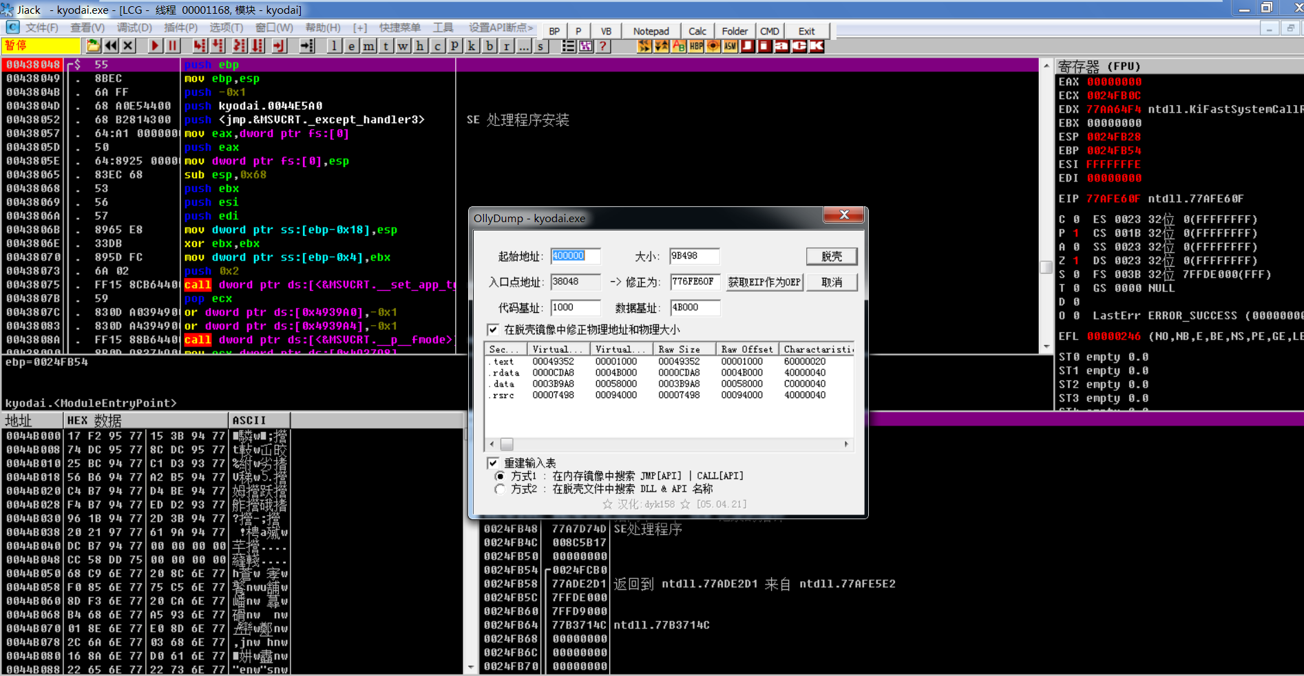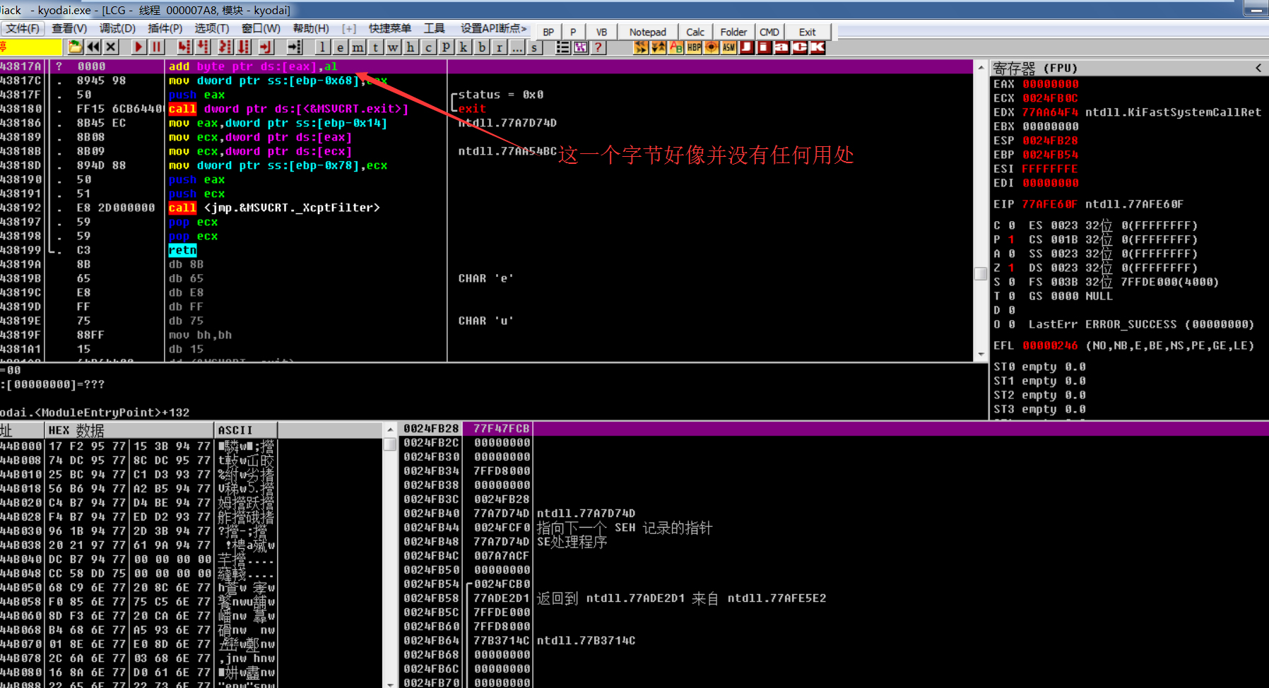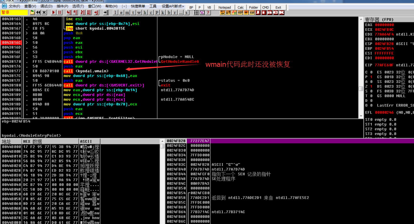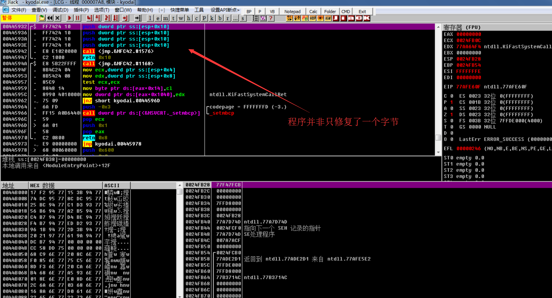 转到另外一个附加的kyodai.exe主程序查看修改的地方 (刚好是wmain函数call里面)