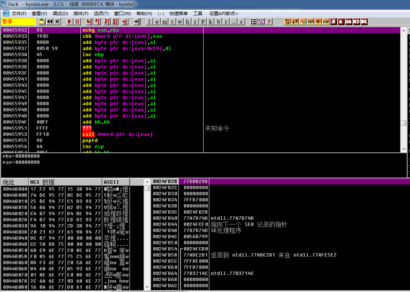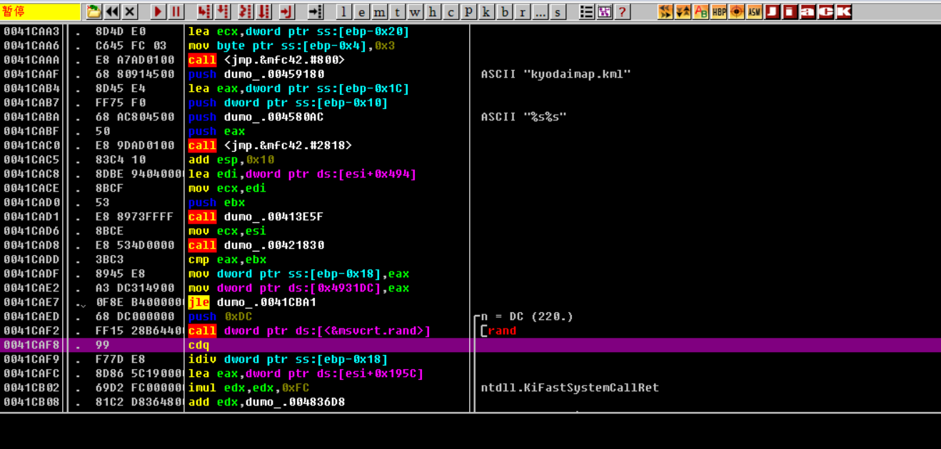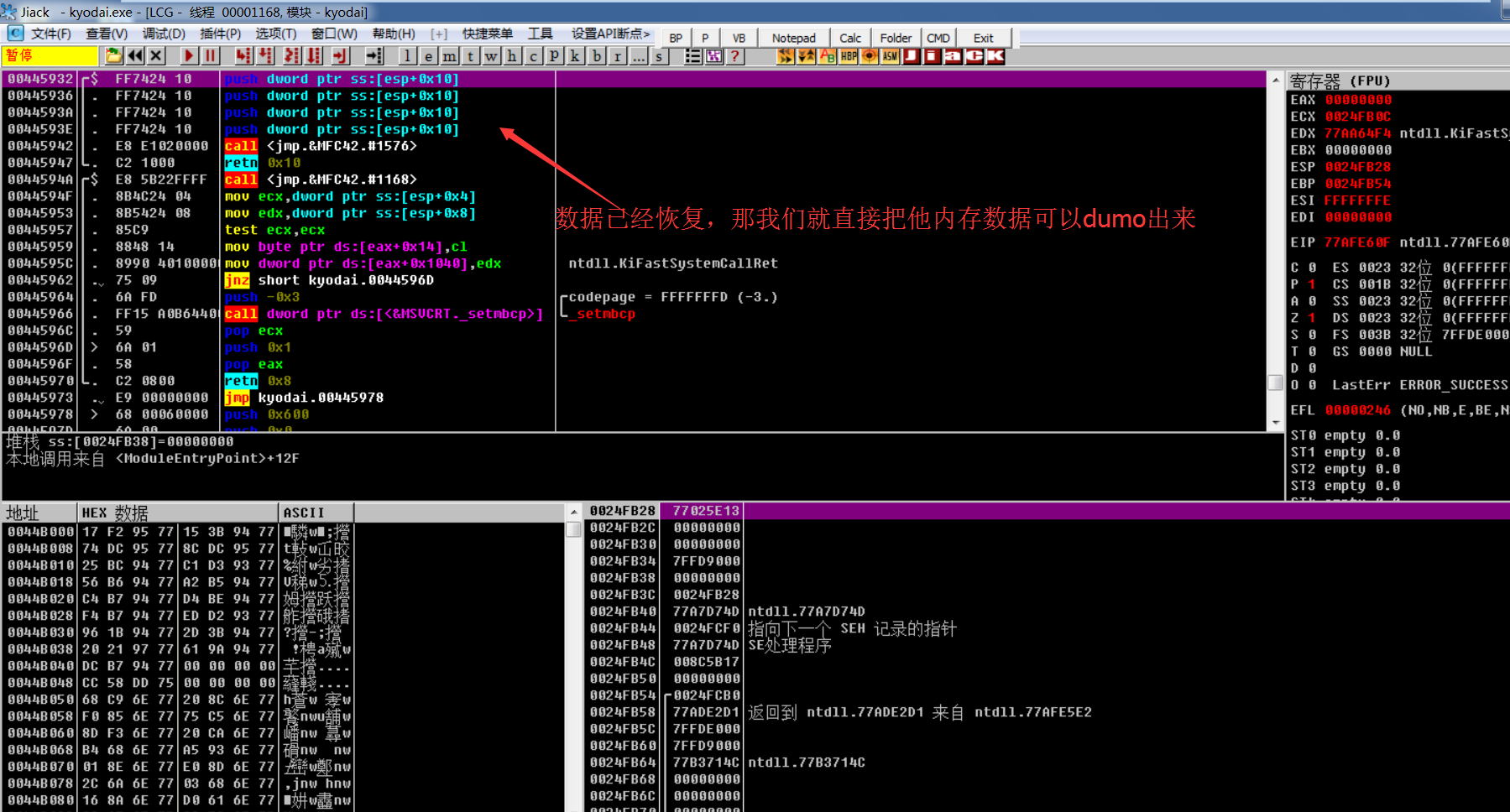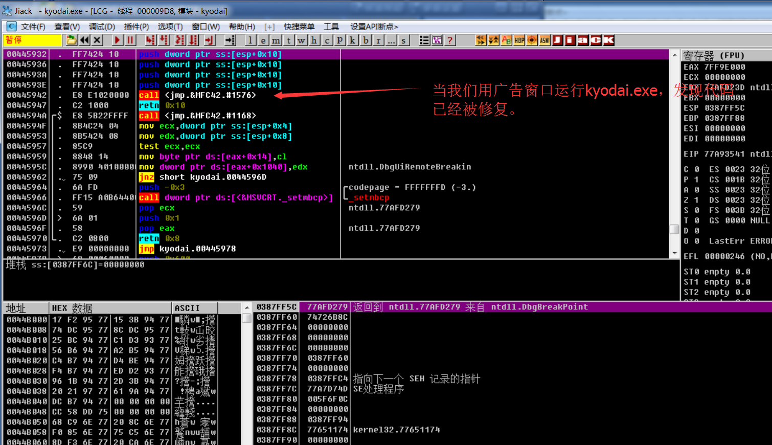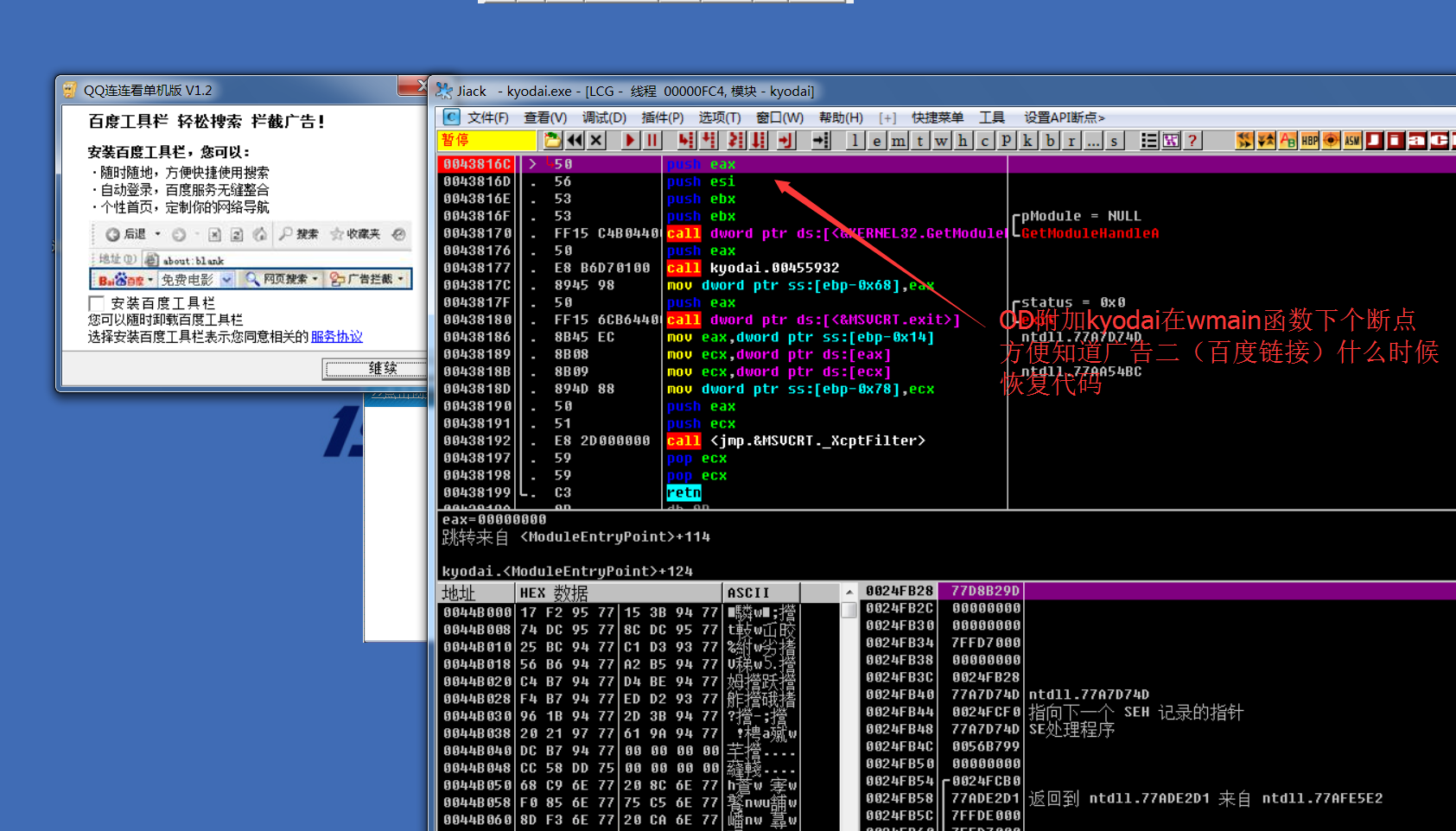 转到另外一个附加的kyodai.exe主程序查看修改的地方 (刚好是wmain函数call里面)