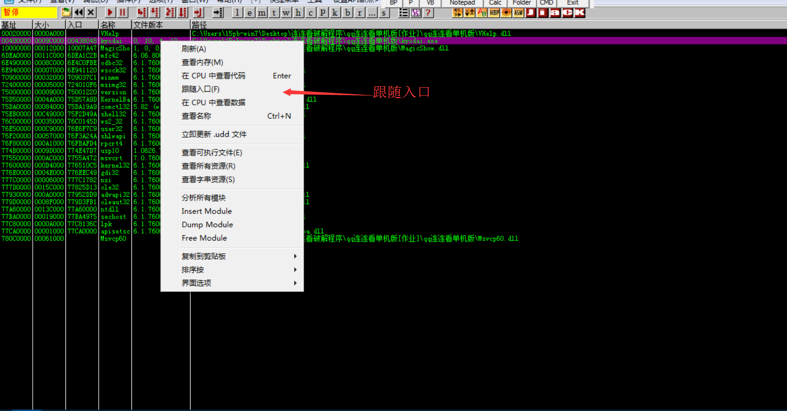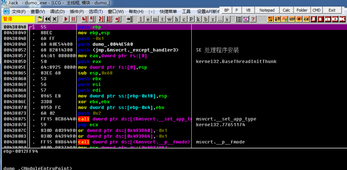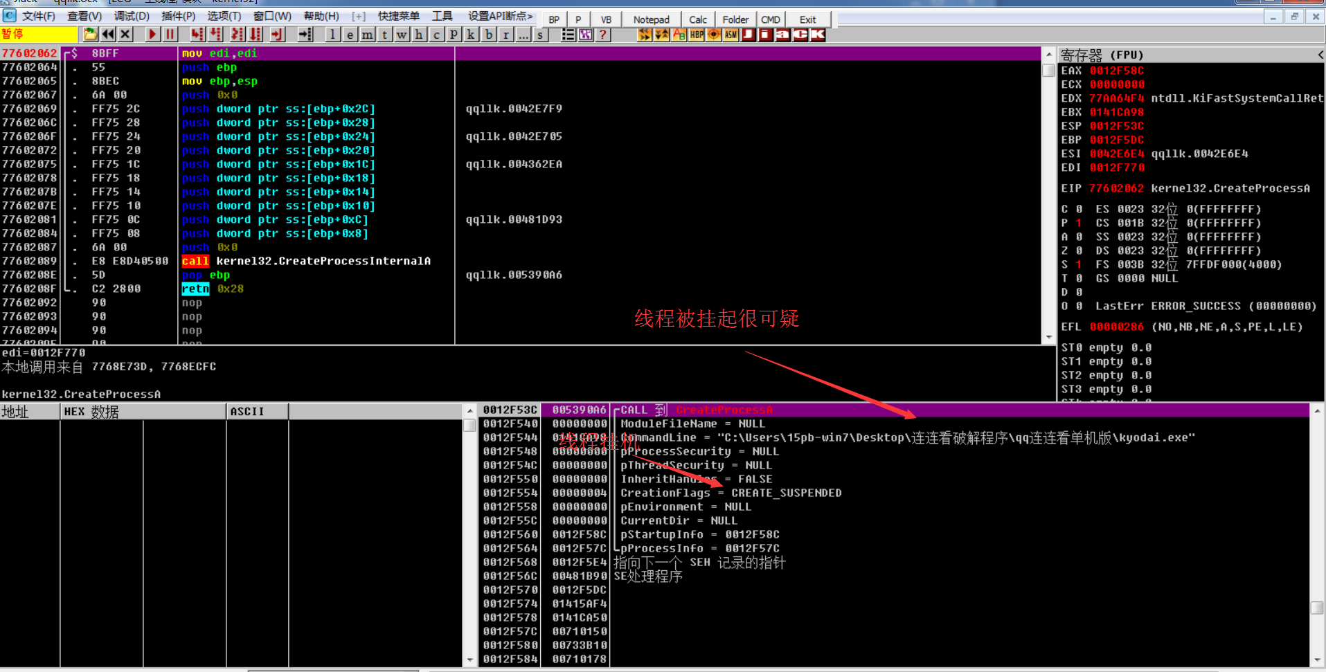 2.3当程序挂起的时候用OD附加主程序(最好在恢复线程之前附加)