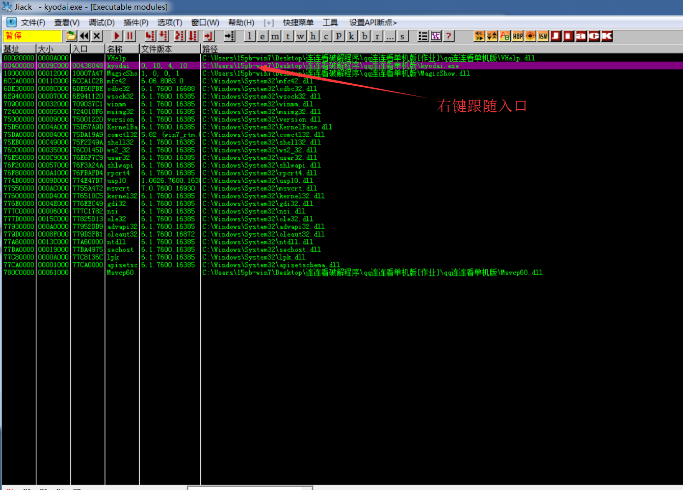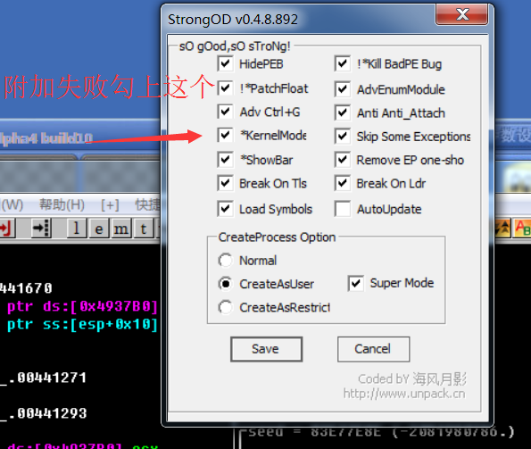 2.5:开两个其中一个OD附加kyodai.exe在winmain下个断点,方便知道什么时候对它修改过
