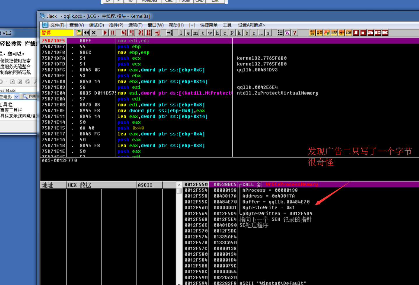 2.6:开两个OD其中一个OD附加广告二(百度链接)下WriteProcessMemory断点