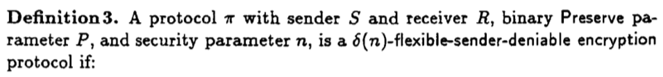 并且这个弱安全的定义实质上是一个"plan-ahead deniable encryption" 即为,在定义3中,加密时已经提前考虑到此条密文应该具有的可否认性质,而不是定义2中,对任意的明文都要做到加密后,