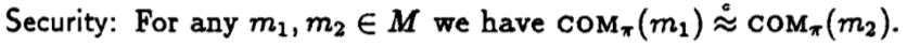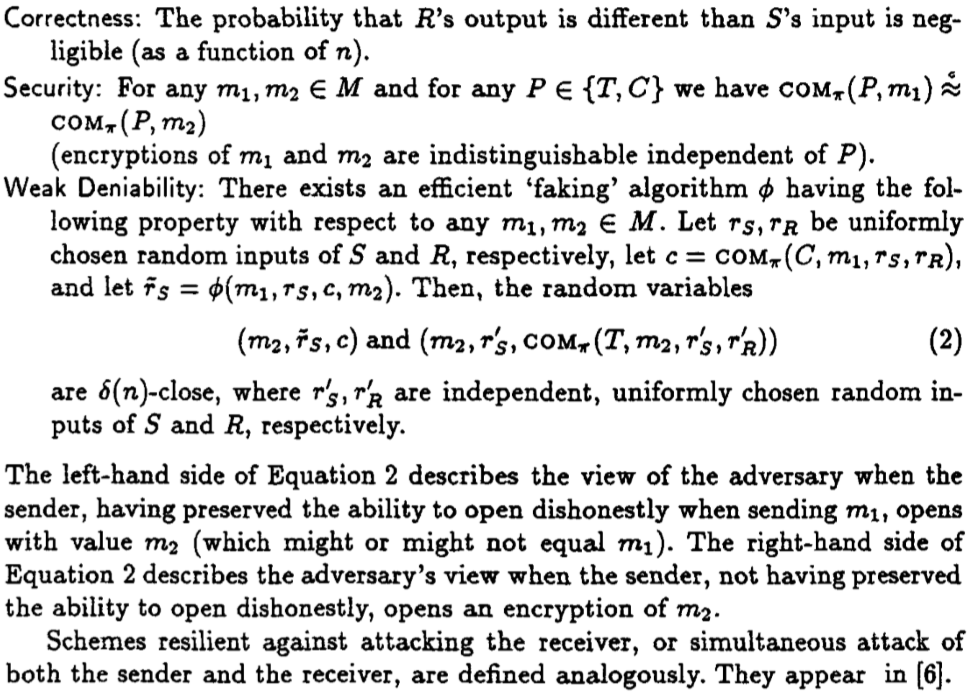 com(m1) 与 com(m2) 计算不可区分,这里实质上有一个问题,发送者可否认的意思就是字面的意思,发送者只能在自己掌握的信息范围内可否认,那么发送者不应当掌握接受方的随机输入Rr信息。