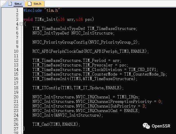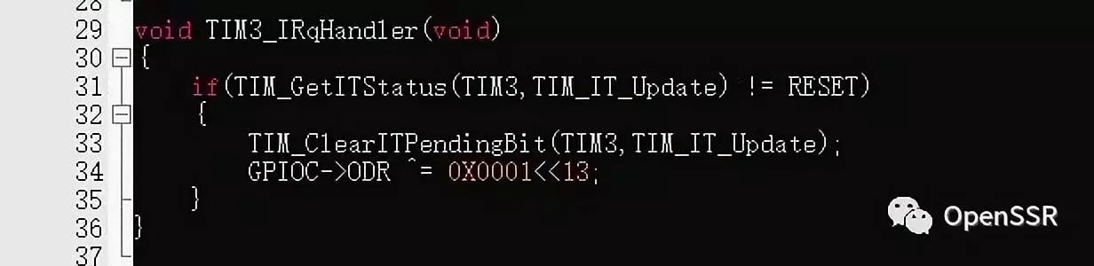 讯享网#include “tim.h” void TIMx_Init(u16 arr,u16 psc) { TIM_TimeBaseInitTypeDef TIM_TimeBaseStructure; //声明TIMx定时器结构体 NVIC_InitTypeDef NVIC_InitStructure; //声明中断优先级结构体 NVIC_PriorityGroupConfig(NVIC_PriorityGroup_2); //配置中断优先级分组 RCC_APB1PeriphClockCmd(RCC_APB1Periph_TIM3,ENABLE); //使能APB1总线上的TIM3时钟 TIM_TimeBaseStructure.TIM_Period = arr; //设置在下一个更新事件活动的自动装载寄存器周期的值 TIM_TimeBaseStructure.TIM_Prescaler = psc; //设置用来作为TIMx时钟频率除数的预分频值 TIM_TimeBaseStructure.TIM_ClockDivision = TIM_CKD_DIV1; //设置时钟分割:TDTS = Tck_tim TIM_TimeBaseStructure.TIM_CounterMode = TIM_CounterMode_Up; //TIM向上计数 TIM_TimeBaseInit(TIM3,&TIM_TimeBaseStructure); //根据指定的参数初始化TIMx的时间基数单位 TIM_ITConfig(TIM3,TIM_IT_Update,ENABLE); //允许TIM3中断更新 NVIC_InitStructure.NVIC_IRQChannel = TIM3_IRQn; //配置外部中断通道 NVIC_InitStructure.NVIC_IRQChannelPreemptionPriority = 0; //设置抢先优先级为0 NVIC_InitStructure.NVIC_IRQChannelSubPriority = 3; //设置子优先级为3 NVIC_InitStructure.NVIC_IRQChannelCmd = ENABLE; //使能外部中断通道 NVIC_Init(&NVIC_InitStructure); //初始化中断优先级 TIM_Cmd(TIM3,ENABLE); //使能TIM3 } void TIM3_IRQHandler(void) //TIM3中断服务函数 { if(TIM_GetITStatus(TIM3,TIM_IT_Update) != RESET) //检查TIM3更新中断 { GPIOC->ODR ^= 0X0001<<13; //PC13高低电平交替翻转 TIM_ClearITPendingBit(TIM3,TIM_IT_Update); //清除TIM3中断标志位 } }