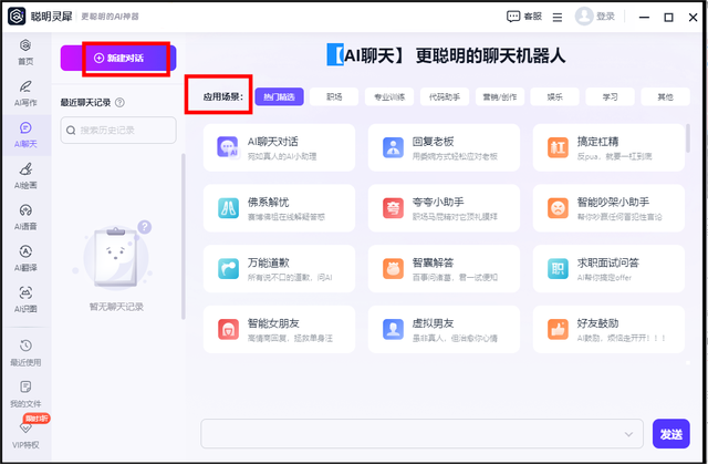 打开软件后点击“AI聊天”按钮,选择一个对话场景或者直接新建对话,在对话框中输入自己的问题,点击发送,等待软件回答。