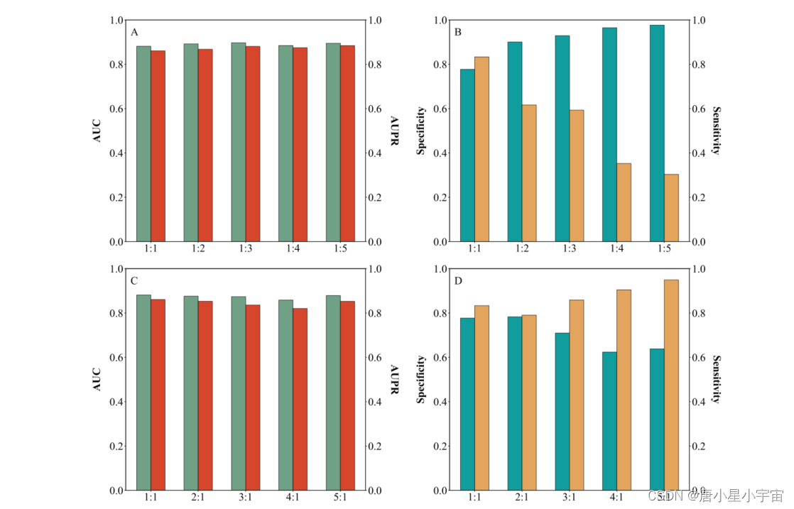 基于具有不同正负样本比例(1:1、1:2、1:3、1:4、1:5、2:1、3:1、4:1 和5:1) 分析负样本或伪正样本的数量如何影响 PHIAF 的性能。