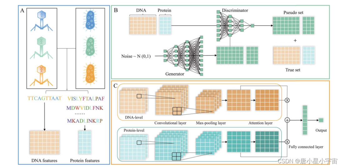 本文从四个广泛使用的数据库下载数据(包括噬菌体、宿主及其相互作用),包括MVP、PhagesDB、VHDB、NCBI合并这些数据以构建具有更多 PHI 的数据集以供研究。首先,删除未在文献中发表或未包含在 NCBI 记录中的 PHI,以确保 PHI 可靠。其次,根据噬菌体的定义删除错误标记为噬菌体/宿主的数据,删除的数据包括不属于病毒的噬菌体和不属于细菌或古细菌的宿主。第三,从 NCBI 数据库中提取剩余噬菌体和宿主的全基因组序列和编码蛋白序列。我们将四个数据库中剩余的噬菌体和宿主结合起来,去除重复,得到5331个噬菌体和235个宿主之间的共5399次交互。噬菌体的数量远大于宿主的数量,一个宿主可能与多个噬菌体相互作用。我们使用算法 去除每个宿主具有高相似性的冗余噬菌体。我们将 0.90 设置为高相似度阈值,这与 CD-HIT 工具 的默认阈值相同。减少冗余后,获得了一个基准数据集,其中包含 304 个噬菌体和 235 个宿主之间的 312 次交互,可用于更好地评估预测模型的性能。在这个数据集中,我们将 312 个已知的 PHI 设置为正样本,并从所有未知的 PHI 中选择负样本,同时确保正样本和负样本的数量相等。