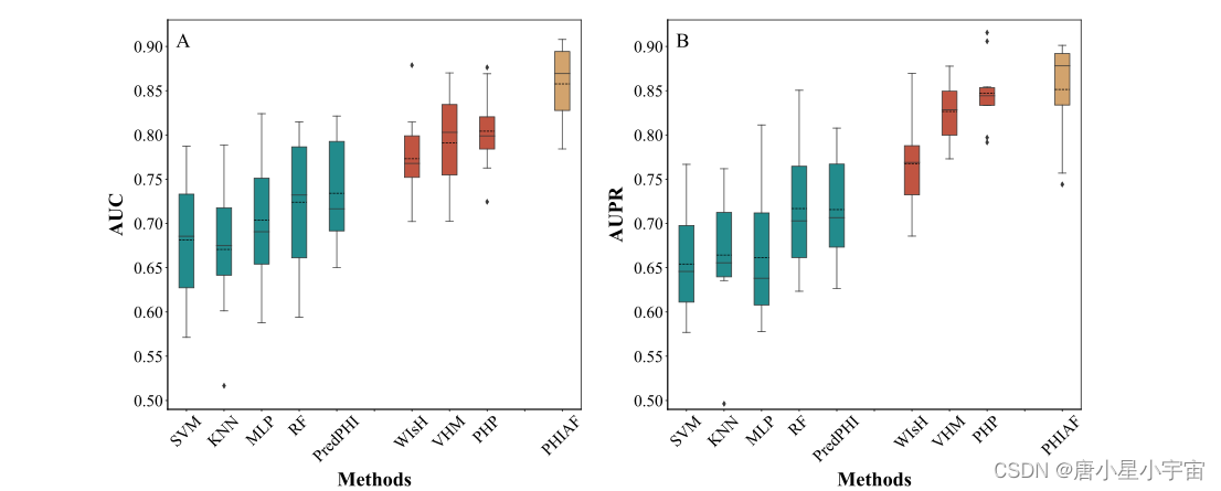 我们随机选择数据集中三分之一的噬菌体和宿主,并将它们及其相互作用用作测试集。剩余的噬菌体和宿主及其相互作用用于训练预测模型。在此实验设置下,测试集中的噬菌体或宿主不包括在训练集,它们被视为看不见的数据。我们基于训练集训练预测模型,然后将训练好的模型应用于测试集,以评估预测模型在未见数据上的性能。为避免评估偏差,我们重复训练和测试 10 次,并采用平均/中值性能。如图 3 所示,PHIAF 优于其他方法,产生更高的平均 AUC (0.86) 和 AUPR 得分 (0.85) 以及合理的标准差,AUC 和 AUPR 得分的中位数分别为 0.88 和 0.87。与 5-CV 结果类似,基于 DNA 序列的方法比基于蛋白质序列的方法产生更好的结果。此外,5-CV 的结果与未见数据测试的比较表明,我们的方法在两种情况下都实现了非常相似的性能(AUC 和 AUPR 相差 2% 和 1%),这些结果表明我们提出的方法是稳健的并且可以在看不见的数据上表现良好,这表明 PHIAF 是一种很有前途的工具,可以从序列数据中识别 PHI。