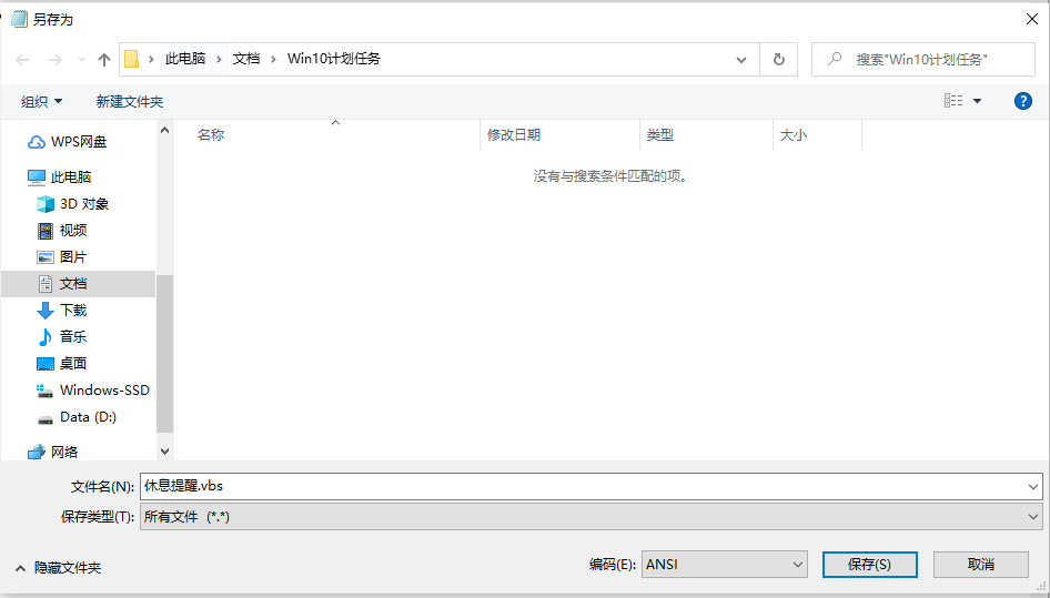 然后,保存文件,如图所示,在保存对话框里选择自己的文件夹,保存类型选择“所有文件(*.*)”,文件名以.vbs结尾。编码一定要选择“ANSI”,不然一会儿执行会报错。点击“保存”。