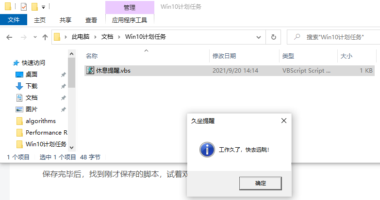 保存完毕后,找到刚才保存的脚本,试着双击执行一下。如果能弹出提醒框,说明脚本没有问题。