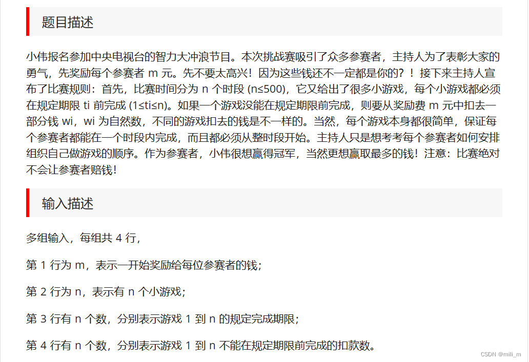 //智力大冲浪 #define _CRT_SECURE_NO_WARNINGS #include<stdio.h> #define N 500 int main() { int m; //表示节目组最初所给出的奖励 int n; //表示有n个小游戏 int lim_t[N]; //每个小游戏规定的时限 int fine[N]; //未在规定时限内完成该小游戏的惩罚 int is_free[N]; while (scanf("%d%d", &m, &n) != EOF) { for (int i = 0; i < n; i++) { is_free[i] = 0; scanf("%d", &lim_t[i]); //每一个小游戏的时限 } for (int i = 0; i < n; i++) { scanf("%d", &fine[i]); //若不能在规定的时间内完成该小游戏时所需要扣除的罚款 } for (int i = 0; i < n - 2; i++) //将两个数组按照罚款数进行从大到小排序 { for (int j = 0; j < n - 2 - i; j++) { if (fine[j]<fine[j+1]) { int temp; temp = lim_t[j]; lim_t[j] = lim_t[j + 1]; lim_t[j + 1] = temp; temp = fine[j]; fine[j] = fine[j + 1]; fine[j + 1] = temp; } } } for (int i = 0; i < n; i++) { for (int j = lim_t[i]; j >= 1; j--) { if (is_free[j] == 0) { is_free[j] = 1; break; } if (j == 1) { m = m - fine[i]; //如果在限期之前的每一个时间段都已经被其它小游戏挤占了,那么就没有时间来完成该小游戏,该小游戏就不能在限定期限内完成,那么就要罚款 } } } printf("%d\n", m); } return 0; }