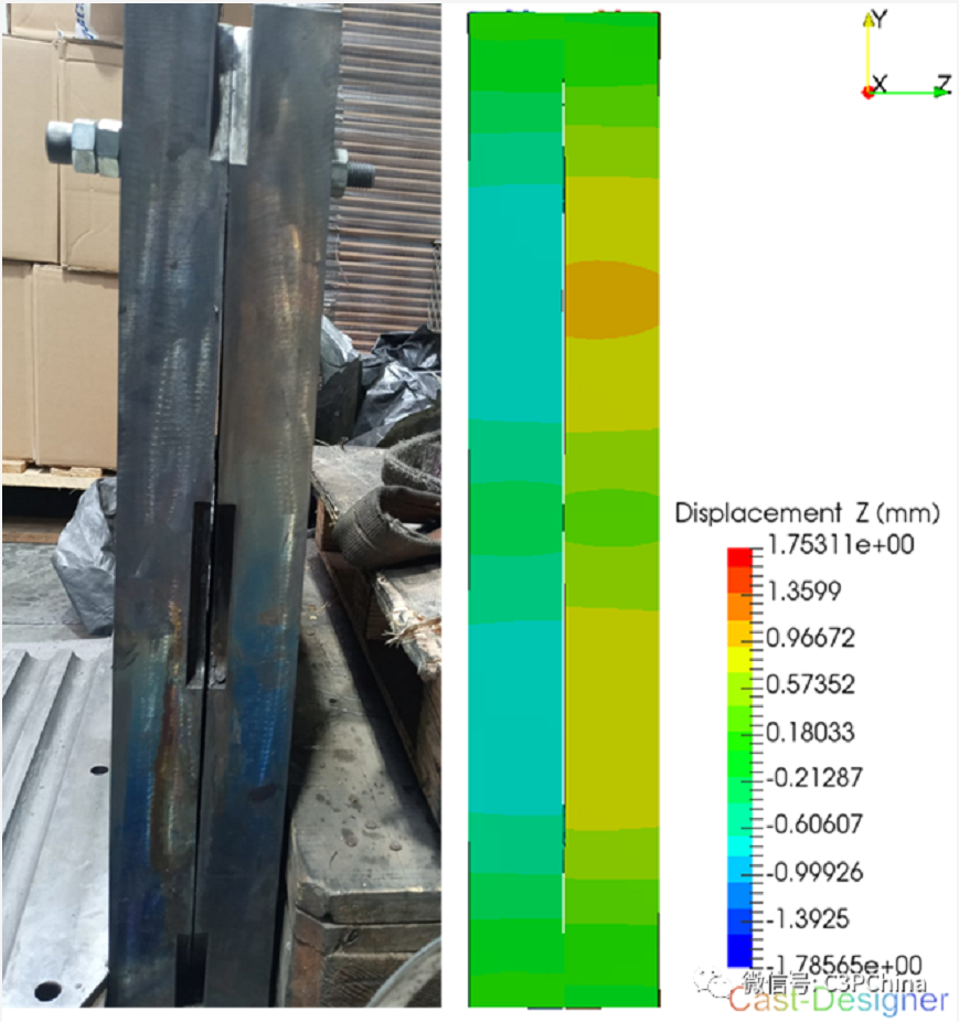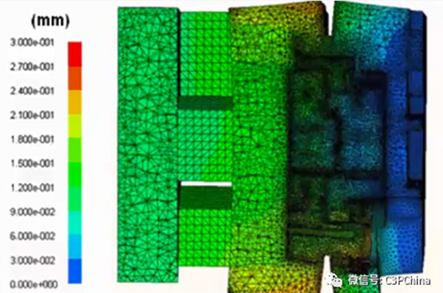 利用结构力学分析软件,分析模具热变形,显示模具张开量达到0.3mm